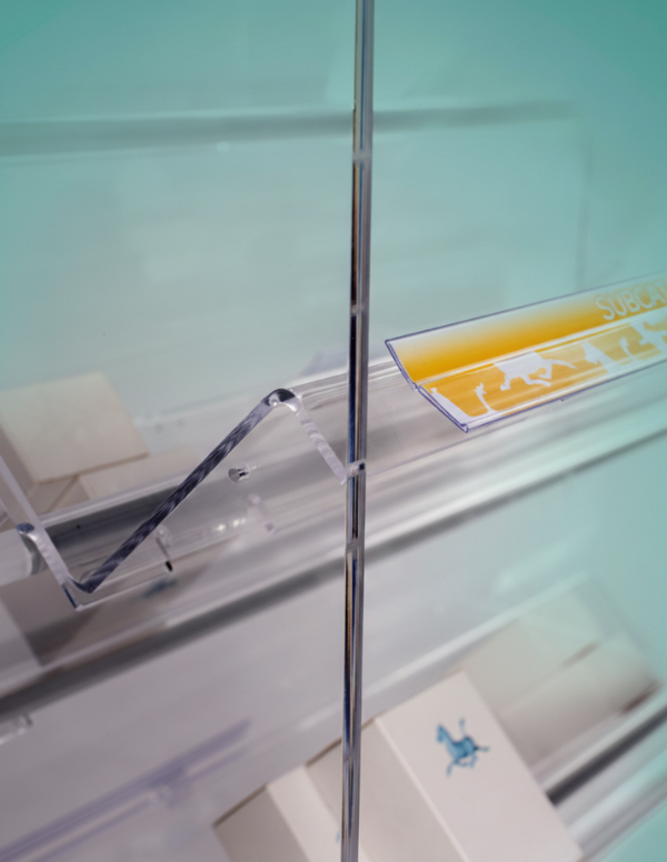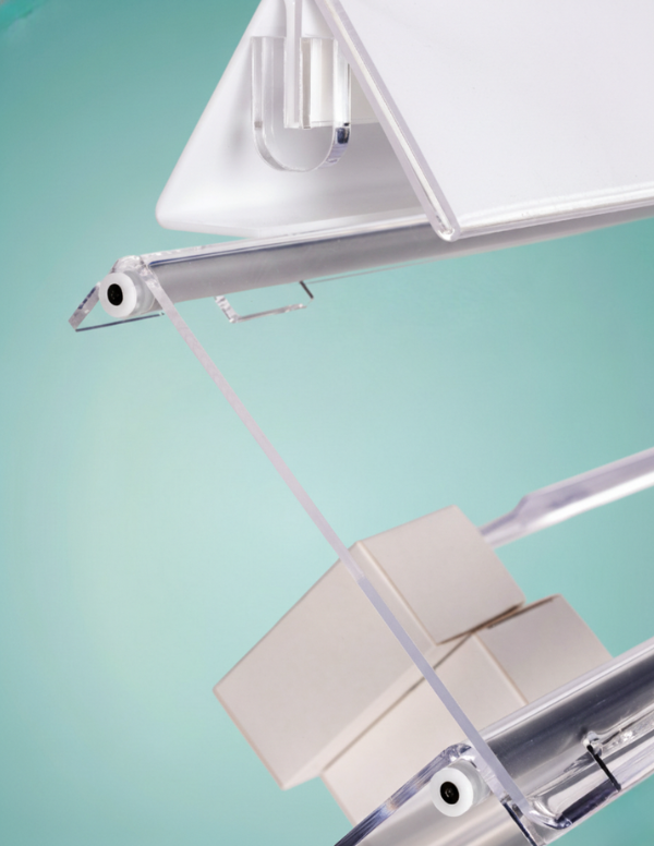 La configurazione a piani inclinati migliora la visibilità frontale del prodotto, mentre la struttura trasparente mantiene leggerezza visiva e controllo totale dello spazio.